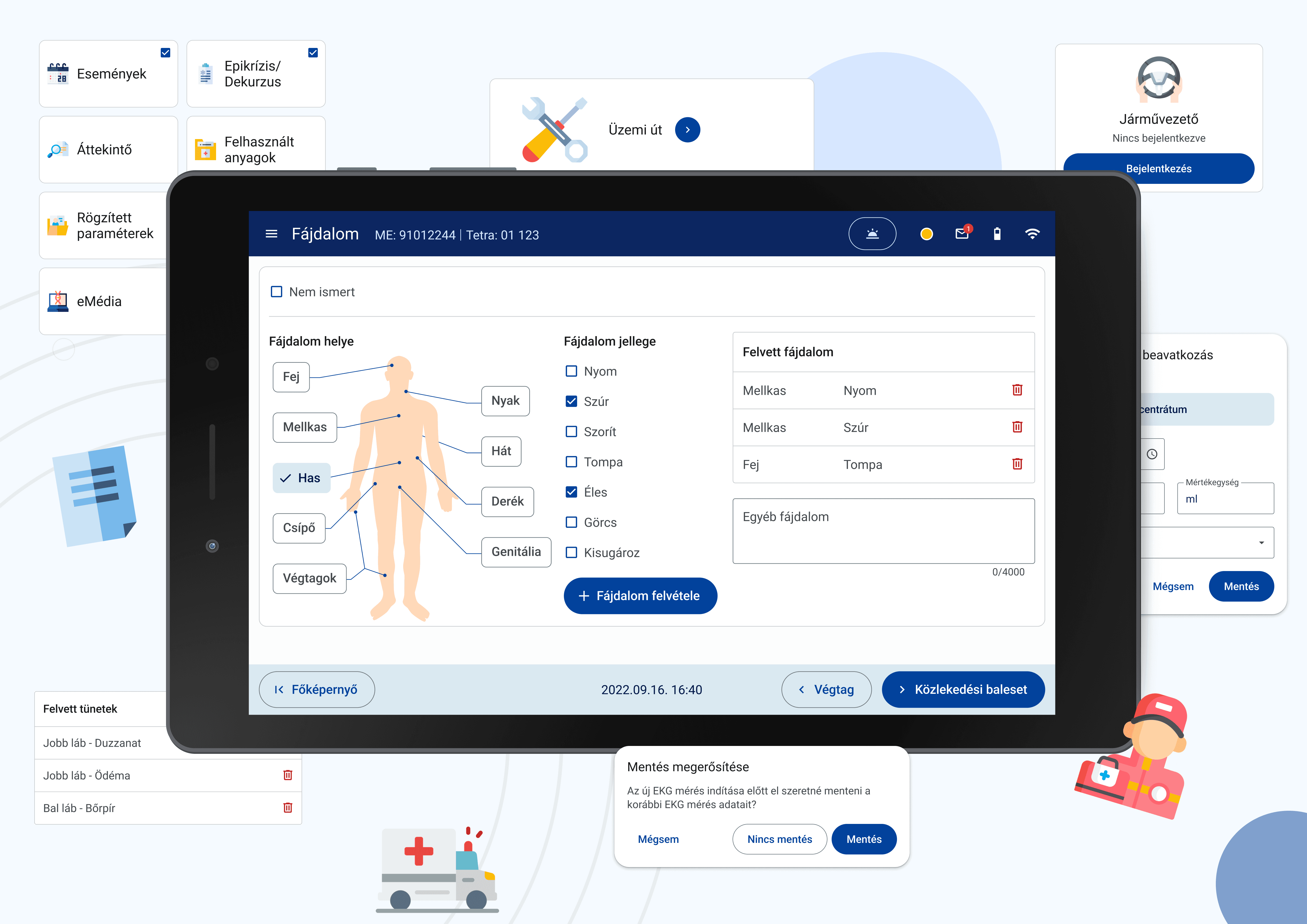 Vonuláskor a mentősök tableten keresztül láthatják a beteg adatait, akihez sietnek éppen. Miután elvégezték a betegellátást, a tableten rögzítik az eset részleteit a teljeskörű dokumentálás érdekében.